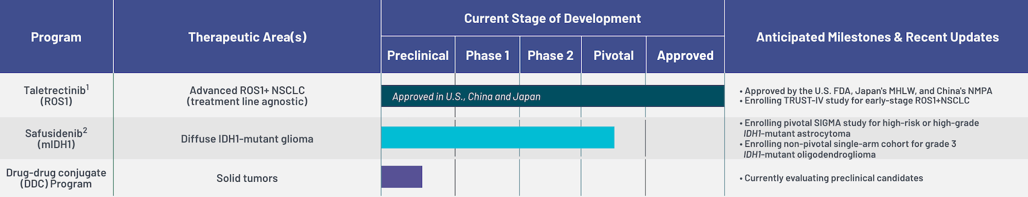 Nuvation Bio is focused on tackling some of the toughest challenges in cancer treatment. Our clinical trial programs include taletrectinib (ROS1 inhibitor), safusidenib (mIDH1 inhibitor), and our Drug-Drug Conjugate (DDC) program.